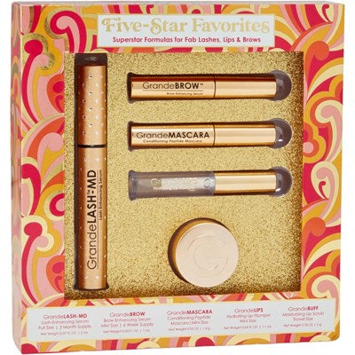 Grande Cosmetics Five Star Favorites includes lash serum, brow serum, mascara, lip plumper, and lip scrub.